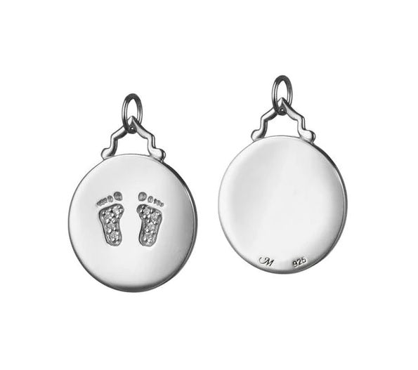 Sterling silver baby feet charm 3/4" disc with white sapphire accents.