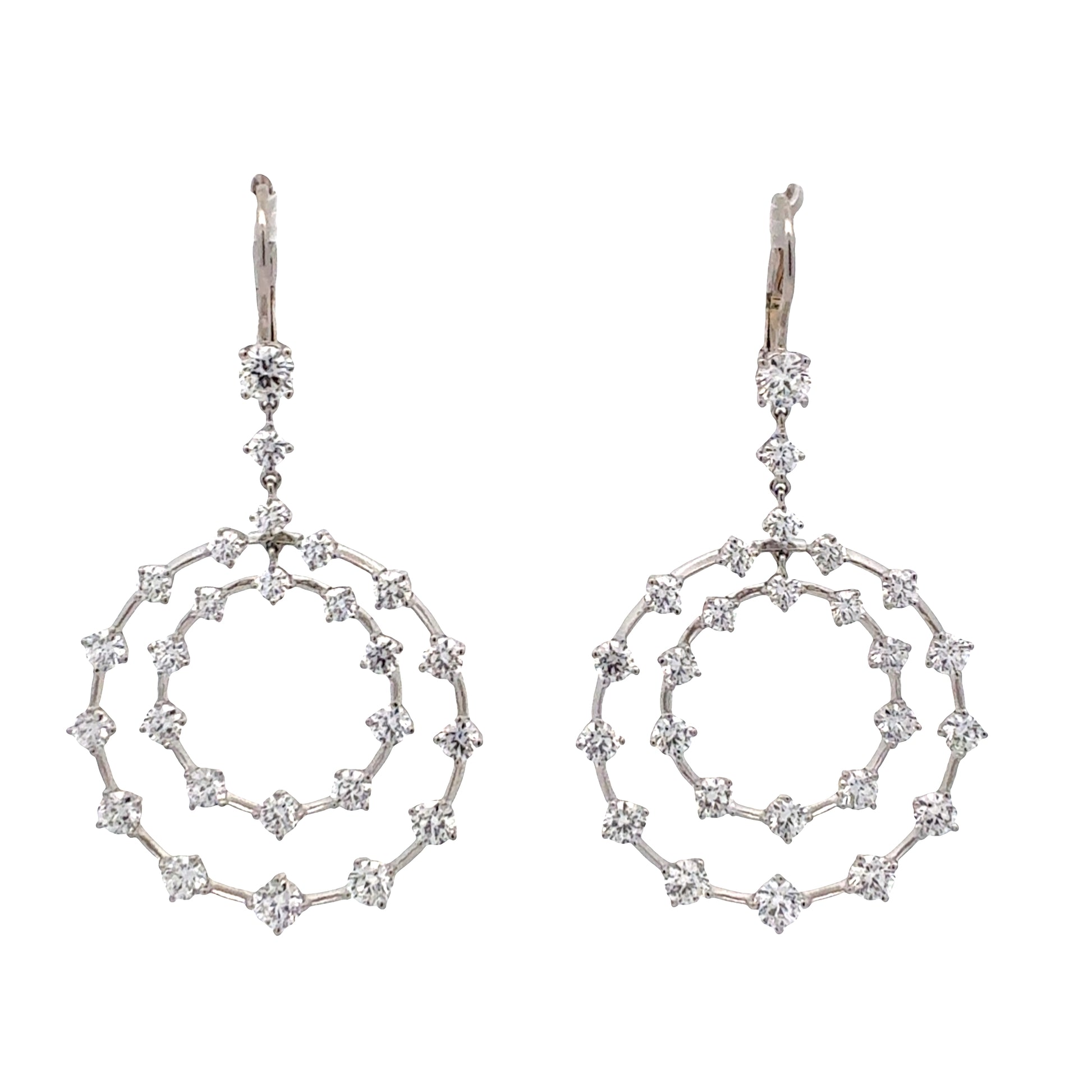 Platinum double circle drop earrings set with (52) round white diamonds totaling 5.19cts. The earrings have lever backs.