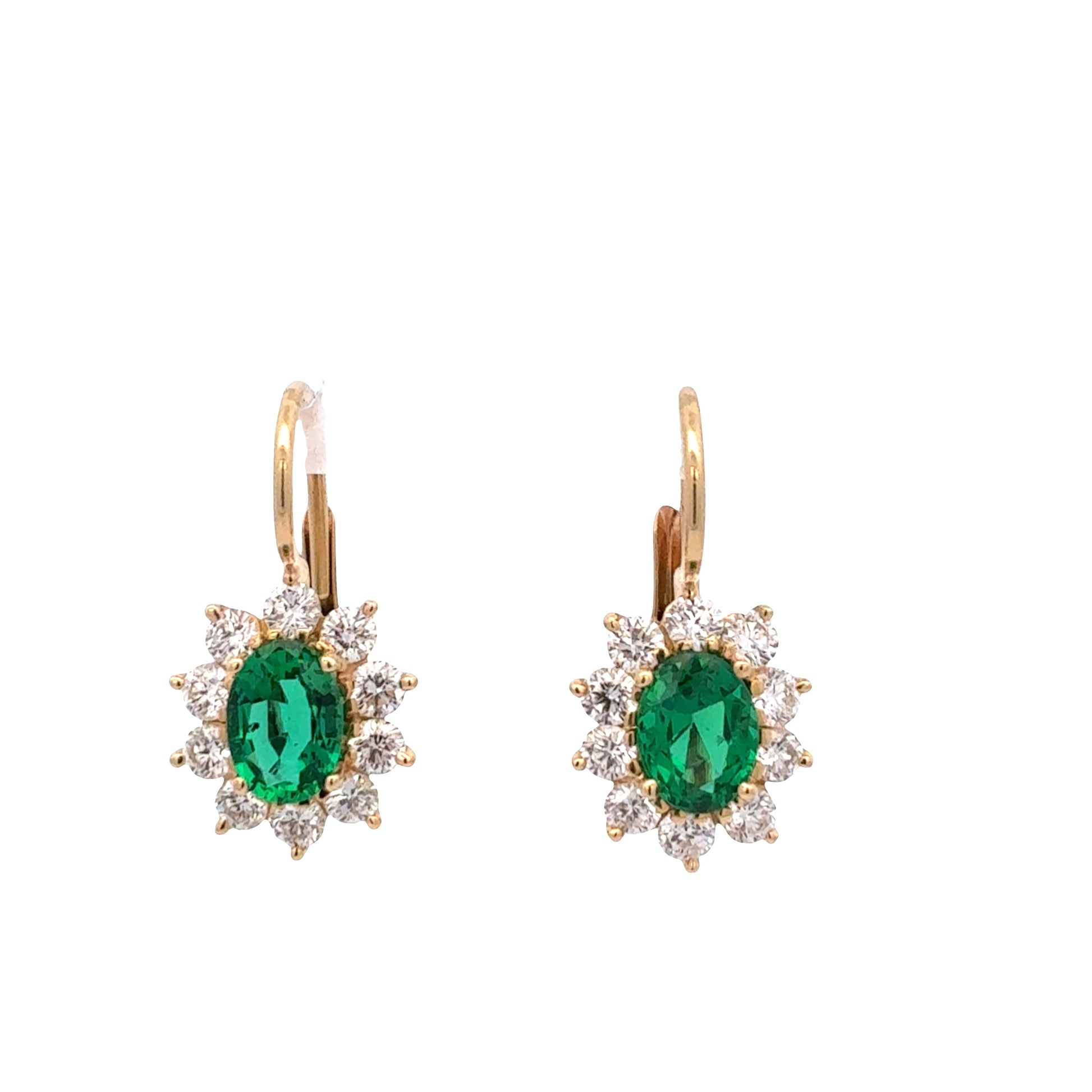 18K yellow gold halo drop earrings set with (2) oval emeralds totaling 1.49cts and surrounded by (20) round white diamonds totaling 1.20cts. The earrings have lever backs