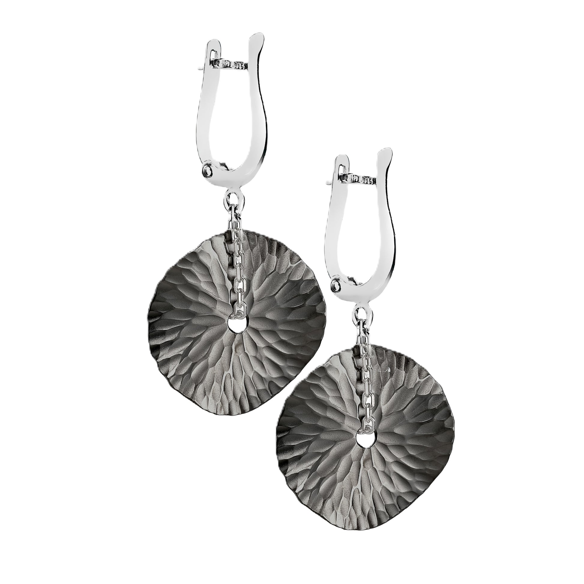 Oasis Medallion earrings, 16mm discs, blackened Ecosilver, matte and burnished.