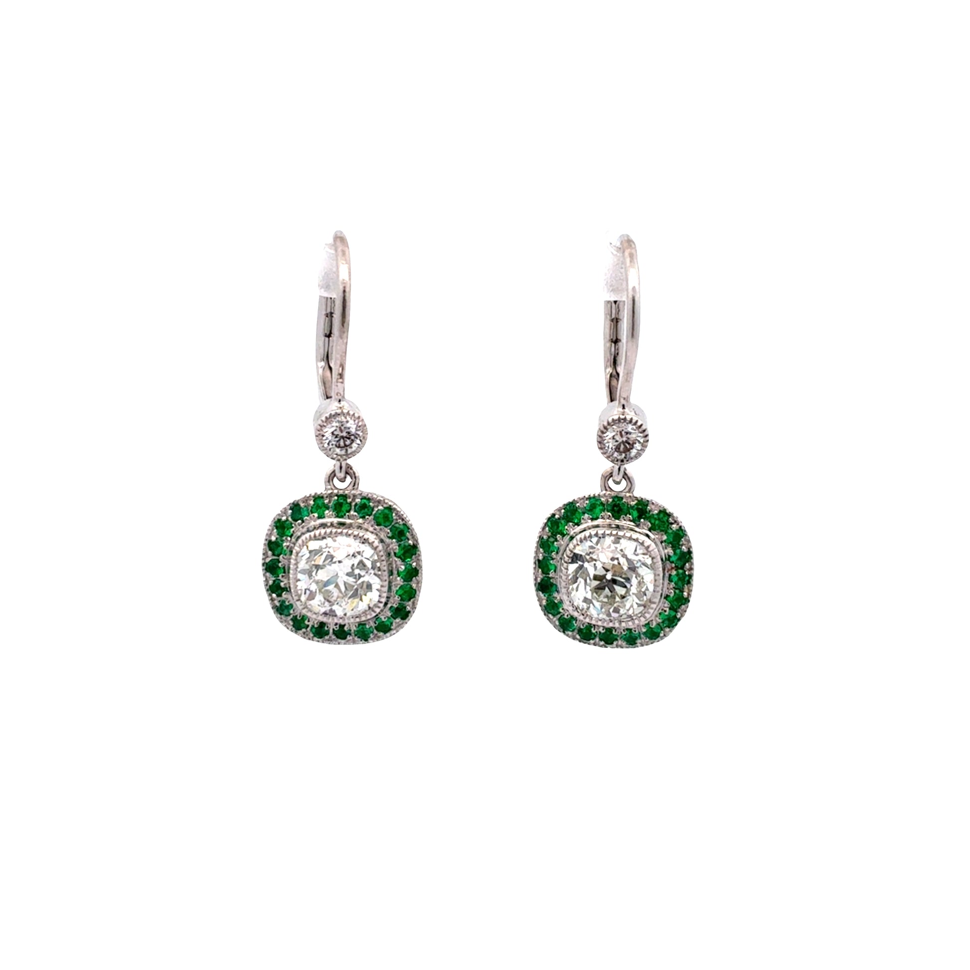 14K white gold hanging halo earrings set with (2) european cut diamonds in center totaling 1.54cts, Color: J; Clarity: VS2. Surrounded by (40) round emeralds totaling .22cts with (2) round diamonds on lever backs totaling .12cts.