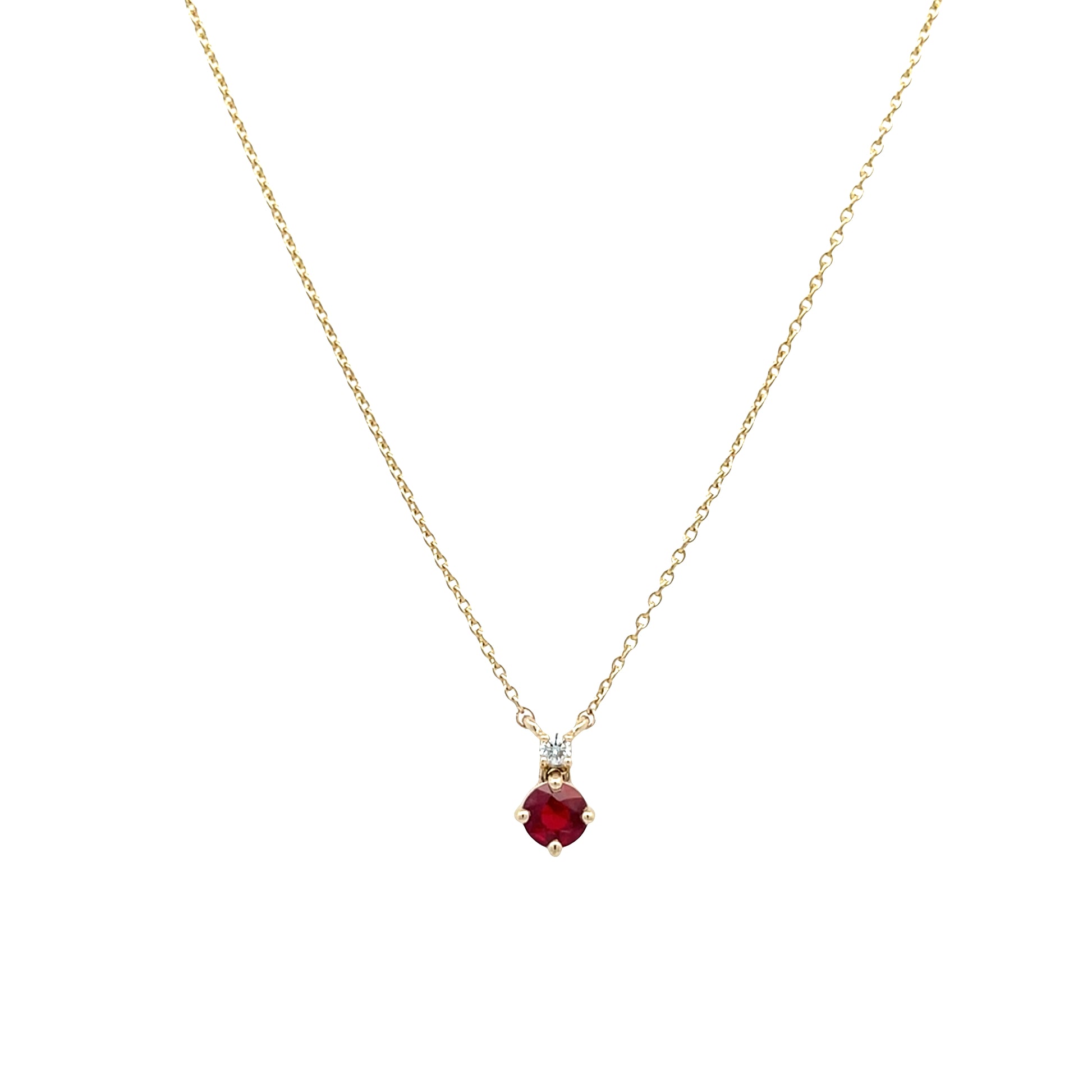 14K yellow gold pendant set wit (1) round ruby weighing .28cts and (1) round diamond weighing .03cts on top. The pendant is on a cable chain in 16 to 18 inches with a lobster clasp.