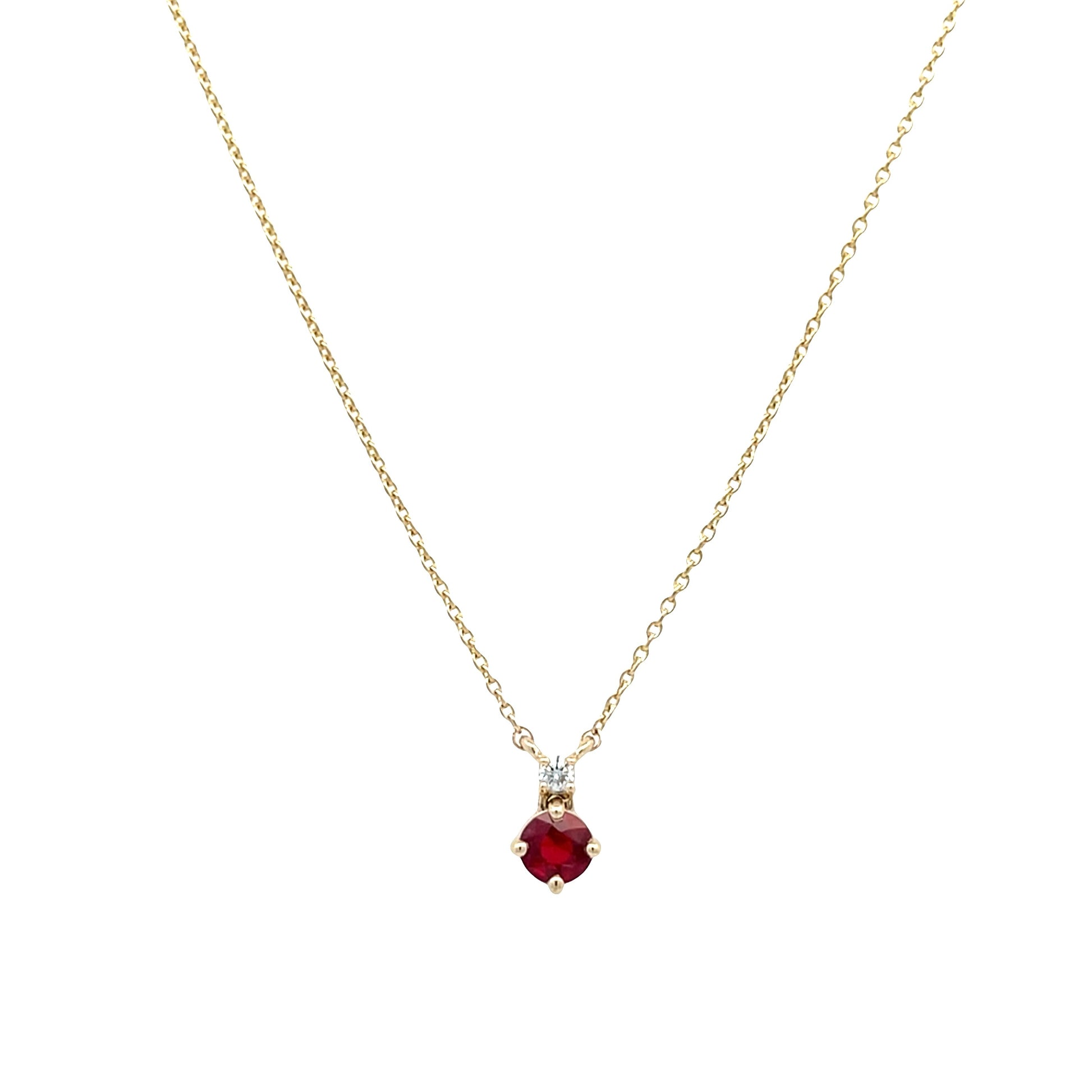 14K yellow gold pendant set wit (1) round ruby weighing .12cts and (1) round diamond weighing .03cts on top. The pendant is on a cable chain in 16 to 18 inches with a lobster clasp.