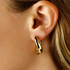 14K yellow gold oval twist hoop earrings. The earrings have a snap latch closing.
